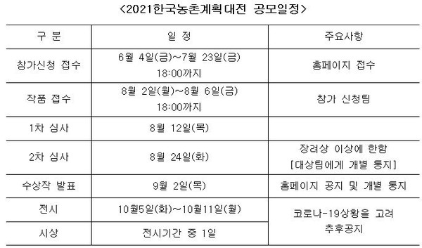 참가신청과 아이디어 제출방법 등 보다 자세한 사항은 공모전 홈페이지(한국농촌계획대전 www.raise.go.kr/ruralplanning, 한국농촌건축대전 www.raise.go.kr/ruralarchi)를 통해 확인할 수 있다.