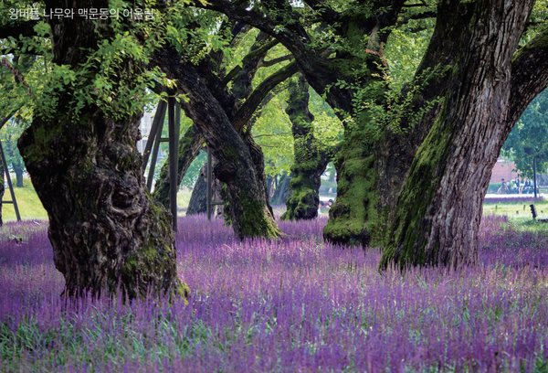 천연기념물 왕버들 나무가 4∼5월이면 연두빛으로 물들고 더위가 한창인 8월이면 아주 오래된 왕버들 나무 주위로 보라색 맥문동이 피어 화려한 색을 자랑한다. 한낮의 태양 빛이 나무 사이로 비집고 내려와 맥문동을 비추면 밝은 보라색 물결이 윤기를 낸다. 이끼가 낀 나무 밑둥은 세월의 깊이를 알려주고 녹색의 이끼와 보라색의 맥문동은 조화롭게 어울려 있다. 왕버들이 탐방객들에 의해 훼손되는 것을 막기 위해 맥문동을 심었는데, 함께 잘 어우러져 사진 전문가들이 가장 선호하는 장소로 떠올랐다.