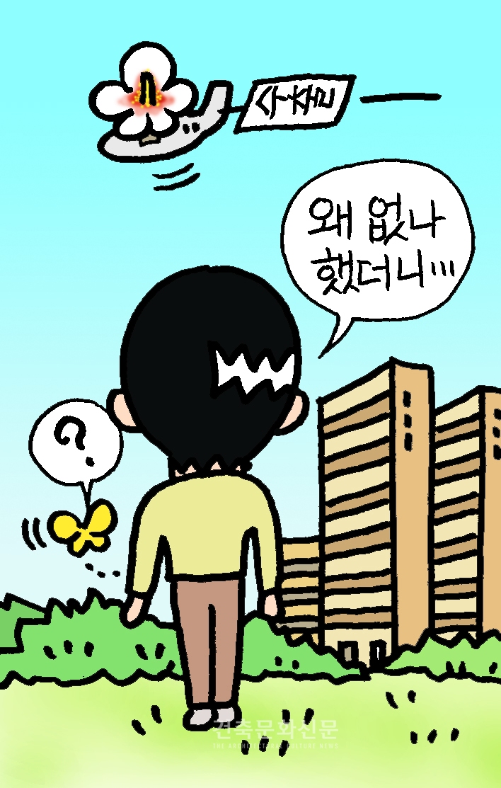 여름 정원을 걷는다. 이웃한 6천여세대의 아파트 단지를 걸으며 보이는 것은 나무나 풀이나 오직 푸르름뿐이다. 아니 한군데, 풀 꽃 원추리가 주황색으로 피었구나. 하지만 나무 꽃은 없다. 진드기 때문이란 것도, 지금은 수종갱신으로 이유가 될 수 없는데도 무궁화는 없다. 옛 시인은 “봄에 뭇 꽃들과 다투지 않고 / 여름에 유독 홀로피어 / 염천의 쇠를 녹이는 더위와 싸우는 무궁화”라고 노래했다. 학교는 물론 길가, 마당가 그리고 아파트단지에 이르기까지 그 흔하던 무궁화의 이러한 수모를, 과연 조경기술사의 탓으로만 돌려야 할 일인지 자문해 본다.
