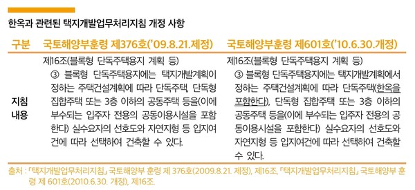 이에 따라 2010년 신한옥플랜 후속조치와 택지개발지구 내 블록형 단독주택용지에 한옥마을(단지) 조성을 유도하도록 ‘택지개발업무처리지침’이 개정됐다.