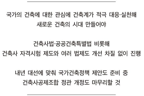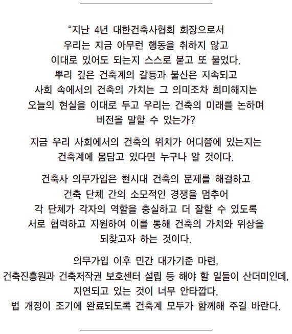 지난 과정에서 여러 어려움과 넘을 수 없어 보이던 장애들이 있었지만 잘 헤쳐 나올 수 있었던 것은 저와 함께 이를 추진한 집행부 임원, 그리고 협회의 진정성을 공감하고 도와주신 건축계 여러분들이 계셨기 때문입니다. 지면을 빌어 감사드립니다.