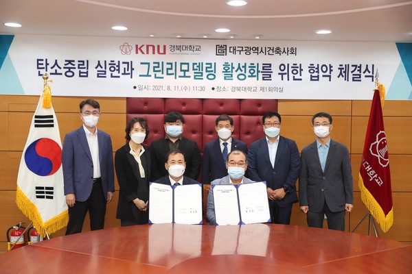 대구광역시건축사회는 경상권 그린리모델링 지역거점 플랫폼의 효율적인 운영과 지역 탄소중립 실현을 위한 인재양성체계 구성을 위하여 8월 11일 경북대 총장실에서 경북대학교와 업무협약을 체결했다.