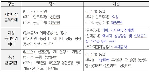 주거용 단독주택 지원 금액은 당초 5,000만 원에서 1억 원으로 늘리고, 공동주택은 2,000만 원에서 3,000만 원으로 확대된다.
