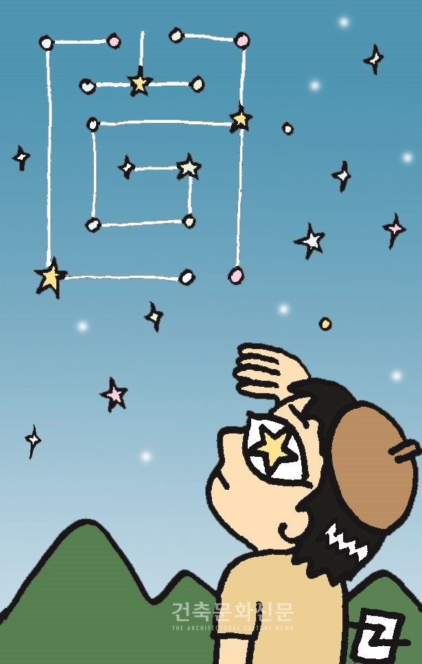 정작 큰곰, 작은곰 등 별자리를 알고나 뒤엔 이런 꿈에 젖어 볼 수 없었다. ▲목동들과 동방박사들이 별을 보고 알게 된 예수탄생이나 삼국지에 사마의가 별로 사람의 운명을 예측하는 등 별과 인간 관계는 그 이전부터 깊다. 서양이 동물이나 신의 이름으로 별자리를 만든 것에 비하여 동양의 중국식은 동서남북을 창룡, 현무, 백호, 주작으로 그리고 중앙을 황룡으로 하여, 중앙을 3원(垣)과 사방을 28수로 나눠 궁궐, 관리, 창고, 군대, 나루터, 시장 등으로 별자리를 삼아 인간세상을 하늘에 옮겨 놓았다. 우리도 고조선시대부터 천문을 관측했고 고구려 고분벽화에는 견우 직녀성과 북두칠성 등이 그려져 있다. 그 분만 아니라 천상열차분야지도에는 중국에 없는 별자리가 새겨져 있어 고도의 독자적 천문학의 발달상을 보여주고 있다. ▲이러한 별자리는 조선시대 한양의 궁궐건축에도 그대로 적용되었음이 증명되고 있다. 즉 경복궁과 천시원, 창경궁과 자미원 그리고 종묘와 태미원의 위치나 형태가 하늘의 삼원과 비슷하다. 또한 경복궁 터가 앞이 좁고 뒤가 넓음이나 은하수와 같은 방향으로 흐르는 냇물, 교태전 뒤쪽 화려한 문양의 굴뚝이 늘어선 모양은 환자별자리 모양이 유사하고 창덕궁의 구선원전, 인정전, 선정전, 희정당, 대조전이 북극오성의 형태를 이루고 있는 점이다. ▲생각은 계속하되 뇌의 이완을 위한 휴식 속에서 새로운 아이디어는 창출된다고 한다. 그래서 휴식은 특히 예술가에게 필요하다는데, 아직도 휴가를 못 떠났다면 하루쯤 한적한 시골마을에서 알퐁스 도데의 ‘별’ 이야기를 자녀에게 들려주며 별바라기를 하는 것도 좋을듯 싶다. “북두(北斗)로 은하수를 퍼서 한밤의 차를 달이니 / 다연(茶煙)은 달 속 계수나무를 싸늘히 감싼다” 진각국사(眞覺國師)처럼 별밤을 즐기면서 차 한 잔을 음미함도 좋을 것이고, “북두칠성으로 은하수를 떠마시겠다”는 송강(松江)선생의 호연지기를 배양함도 좋지 않은가. 게다가 고민하던 작품의 아이디어까지 얻으면 금상첨화다.