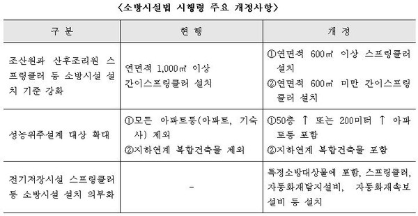 내년 2월 25일부터 행정기관이 건축허가 등을 할 때 소방본부장 또는 소방서장의 동의를 받아야 하는 건축물 등의 범위에 조산원과 산후조리원이 추가되고, 산후조리원과 조산원 등은 화재 시 인명피해를 예방하고자 스프링클러(연면적 600제곱미터 이상) 또는 간이스프링클러(연면적 600제곱미터 미만)를 의무적으로 설치해야 한다. 또 성능위주설계 대상인 특정소방대상물에 지하층을 제외한 층수가 50층 이상이거나 건축물의 높이가 200미터 이상인 아파트 등이 추가된다.