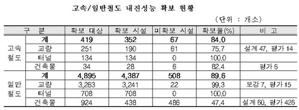 국회 국토교통위원회 소속 박성민 의원이 국가철도공단으로부터 받은 자료에 따르면 ‘고속철도’ 건축물·교량·터널 등의 평균 내진성능 확보율은 84%, ‘일반철도’ 건축물·교량·터널 등의 평균 내진성능 확보율은 89.69%인 것으로 나타났다.