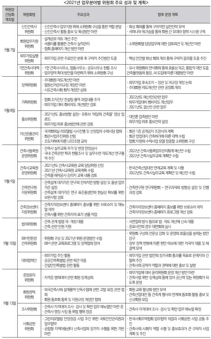 대한건축사협회(이하 협회)는 지난 9월 7일부터 13일까지 업무분야별 위원회 위원장 간담회를 개최했다.