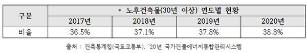 전국 건축물 중 사용승인 후 30년 이상 경과한 노후 건축물은 282만동으로 전체 건축물의 38.8% 수준이다. 문제는 관련한 사고사례이다. 최근 광주 단독주택 붕괴사고, 당진 마을회관 난간 붕괴사고 등 소규모 노후 건축물로 인한 인명피해가 지속적으로 발생하고 있다.