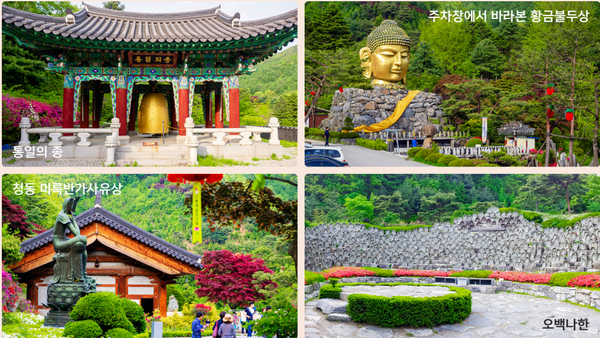 통일에 대한 염원을 담은 이곳에는 ‘통일의 탑’과 ‘통일의 종’이 있다. 통일의 종은 88서울올림픽 개회식에 타종식을 가졌던 세계 최대의 ‘황금의 종’이다. 통일을 기원하며 만든 통일의 종은 통일 신라시대의 황룡사종과 같은 크기이며, 황금과 동, 그리고 주석으로 만든 황금범종이다. 대웅전에 모셔진 ‘장육존상 오존불’은 인도에서 가져온 팔만 오천근의 동으로 십여 년간 만든 불상이며, 대웅보전 옆의 ‘청동미륵반가유상’ 역시 국내 최대 크기를 가지고 있다.
