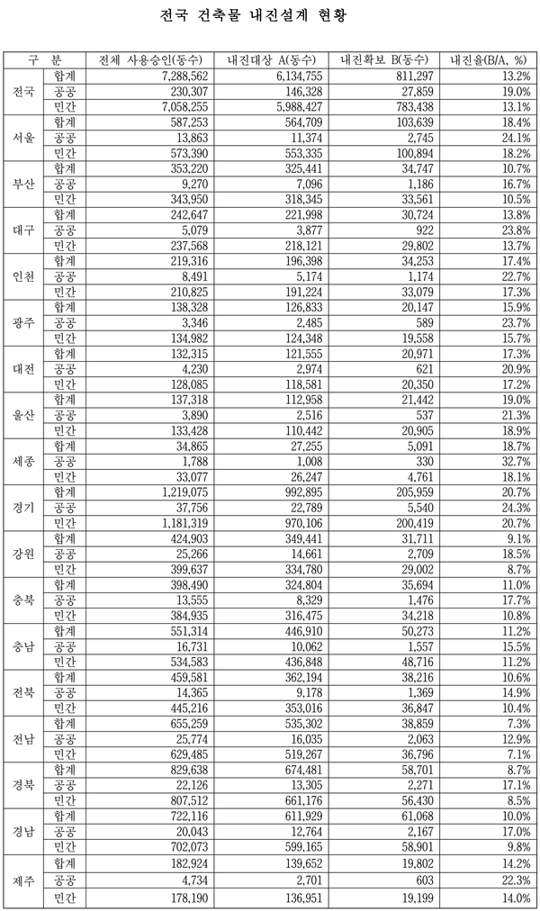 내진율은 기존 시설물 중 내진설계 기준을 적용했거나 내진보강 등을 통해 내진성능이 확보된 시설물의 비율을 뜻한다. 전국의 공공건축물 내진율은 19.0%인데 반해 공공건축물 동수에 30배가 넘는 민간건축물의 내진율은 13.1%로 현저히 낮은 수준에 머무르는 실정이다.