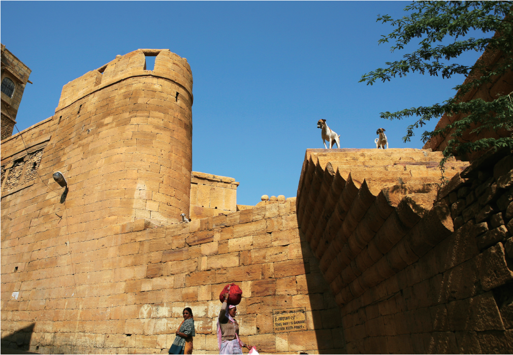 인디아 서북부 라자스탄 사막 언덕 위에 사암으로 건축된 자이살메르 성채(Jaisalmer Fort). 천 년 가까이 된 유적지에서 사람들이 모여 살고 있는데 심심찮게 거리를 활보하는 견공들이 보인다. 짐을 이고 들고 부산하게 오가는 사람들 위로 성루에 오른 견공들은 마치 기상나팔을 부는 나팔수 같다. 푸른 하늘처럼 힘차게 움직이라는 신호를 보내는 듯하다.