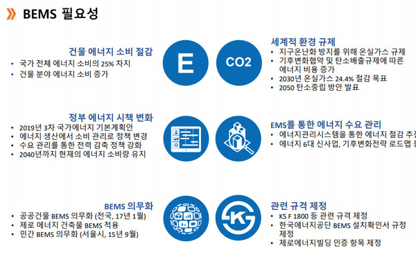우리나라에서도 날로 BEMS의 중요성이 강조되고 있다. 지난 2017년부터는 정부가 대규모 공공건물(연면적 1만 제곱미터 이상)에 BEMS 설치를 의무화하며 BEMS 보급에 속도가 붙고 있다.