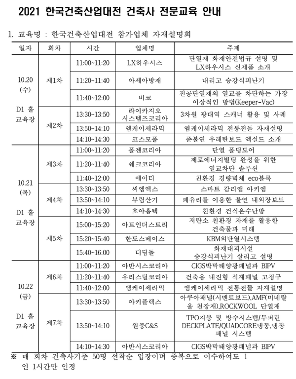 코엑스 D1홀 교육장에서 이뤄지는 건축자재 설명회는 1차 교육이 오전 11시부터 12시, 2차 교육이 오후 1시 30분부터 2시 30분까지, 3차 교육은 오후 3시부터 오후 4시까지 이뤄진다. 차수당 최대 50명까지 참석할 수 있다. 2, 3일차 교육 역시 같은 시간대에 이뤄지며 4일차에는 교육이 없다.