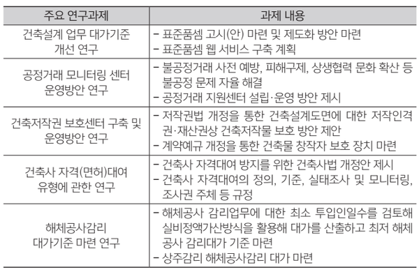 건축연구원은 올 한해 건축서비스산업의 중단 없는 발전과 개선을 위해 연구 결과물을 지속적으로 생산하고 있다. 건축연구원의 주요 연구과제로는 ▲건축설계 대가기준(표준품셈) 마련 ▲공정거래 모니터링 센터 운영방안 ▲건축저작권 보호센터 구축 ▲건축사 자격(면허)대여 ▲해체공사감리 대가기준 마련 ▲의무가입 비전 및 2022 대선관련 도시·건축 정책 마련 등이다.
