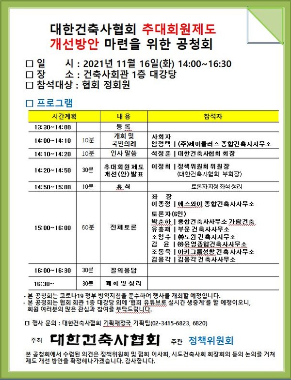 임정택 건축사의 사회로 진행되는 이날 공청회는 이정희 협회 정책위원장의 추대회원제도 개선안 발표와 박춘하, 유흥재, 조영수, 김윤, 조동욱, 김용각 건축사가 참여하는 전체토론 순으로 진행된다. 토론의 좌장은 이종정 건축사가 담당한다.