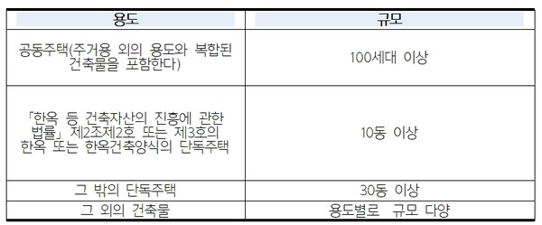 법 개정으로 공동주택의 특례 대상은 기존 300가구 이상에서 100가구 이상으로, 한옥은 50동 이상에서 10동 이상으로 각각 늘어났다. 기존에 특례 대상이 아니던 단독주택도 30동 이상 요건을 갖추면 신청이 가능해졌다.