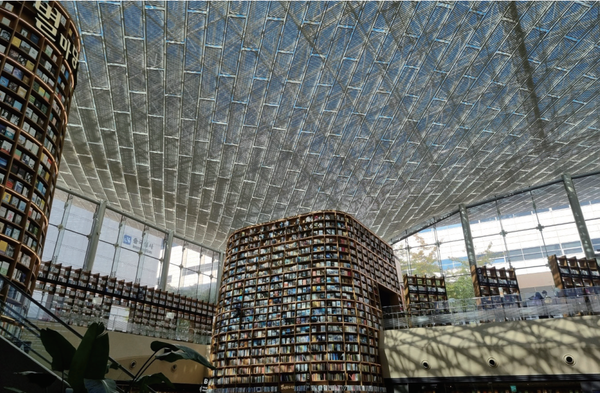 지난 10월, 2021 한국건축산업대전이 열린 코엑스 지하 1층 별마당도서관은 지하 공간에서 중심 역할을 하고 있습니다. 텅 빈(void) 열린 공간에 자유로운 내부 공간구성으로 이곳을 지나가는 누구나 자유롭게 접근할 수 있습니다. 지붕 전체를 덮는 투명한 천창은 공간에서 느끼는 개방감을 배가시킵니다. 투명한 천창으로 내려오는 햇빛은 도서관으로서의 기능적 한계를 드러내는데, 한계를 해결하기 위한 도구로서 메쉬 형태의 반자를 사용하여 직사광선의 일부를 차단해 그림자를 만들고 일부의 빛을 투과시켜 채광을 합니다. 이로 인해 만들어진 그림자는 공간의 형태를 다채롭게 만들어 줌과 동시에 개방된 쉘터로서 공간의 안정감을 부여하는 것 같습니다.