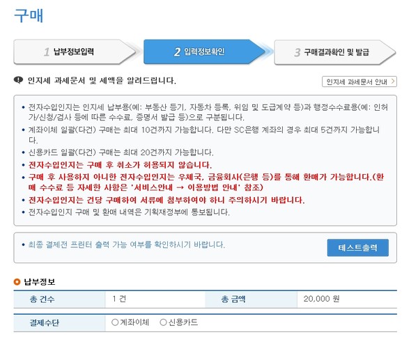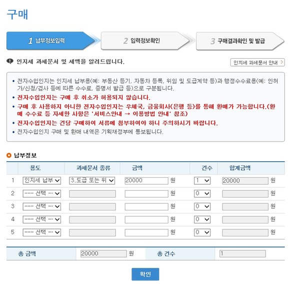 먼저 납부정보입력 페이지에서 ‘용도’ 항목에서 ‘인지세 납부’를, 과세문서 항목에서는 ‘도급 또는 위임에 관한 증서’를 선택한 후 수임액수를 기록한다. 다음으로 입력정보확인 페이지에서 결제정보를 확인하고 결제한 뒤 구매결과 확인 및 발급 페이지에서 최종확인을 거쳐 발급받으면 된다.