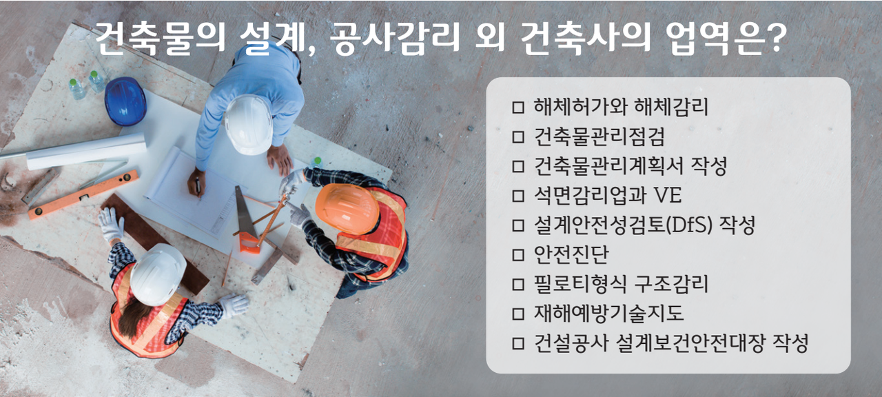 대한건축사협회 최초로 회원들의 절대적인 지지를 얻어 석정훈 본 협회장님이 연임한 가운데 건축사의 위상과 업역 확대 노력이 성과로 이어지고 있다. 건축사 업역이 넓어짐에도 현재 많은 회원이 새로운 업역에 대한 두려움 내지 불안감으로 진출이 더뎌 안타까운 마음에 이런 글을 올린다. 건축물의 설계, 공사감리 이외에 최근 건축사의 업역으로 어떤 것이 있는지 살펴본다.