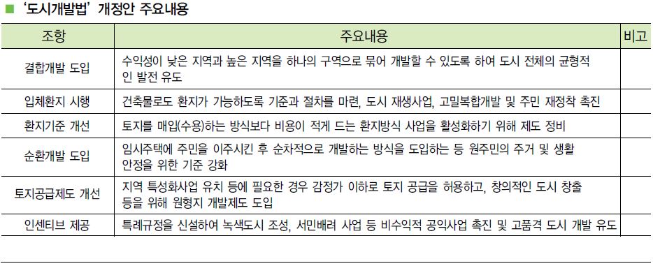 그동안 도시개발사업은 소위 ‘잘 팔리는 지역만 골라서 개발’하는 수익성 위주, 주택단지 조성 중심의 편중된 개발로 도시가 평면적이고 개성없이 획일적으로 조성되었을 뿐만 아니라 개발지역 토지의 전면 수용에 따른 지역 공동체(커뮤니티) 붕괴 문제 등도 지적되어 왔다.
