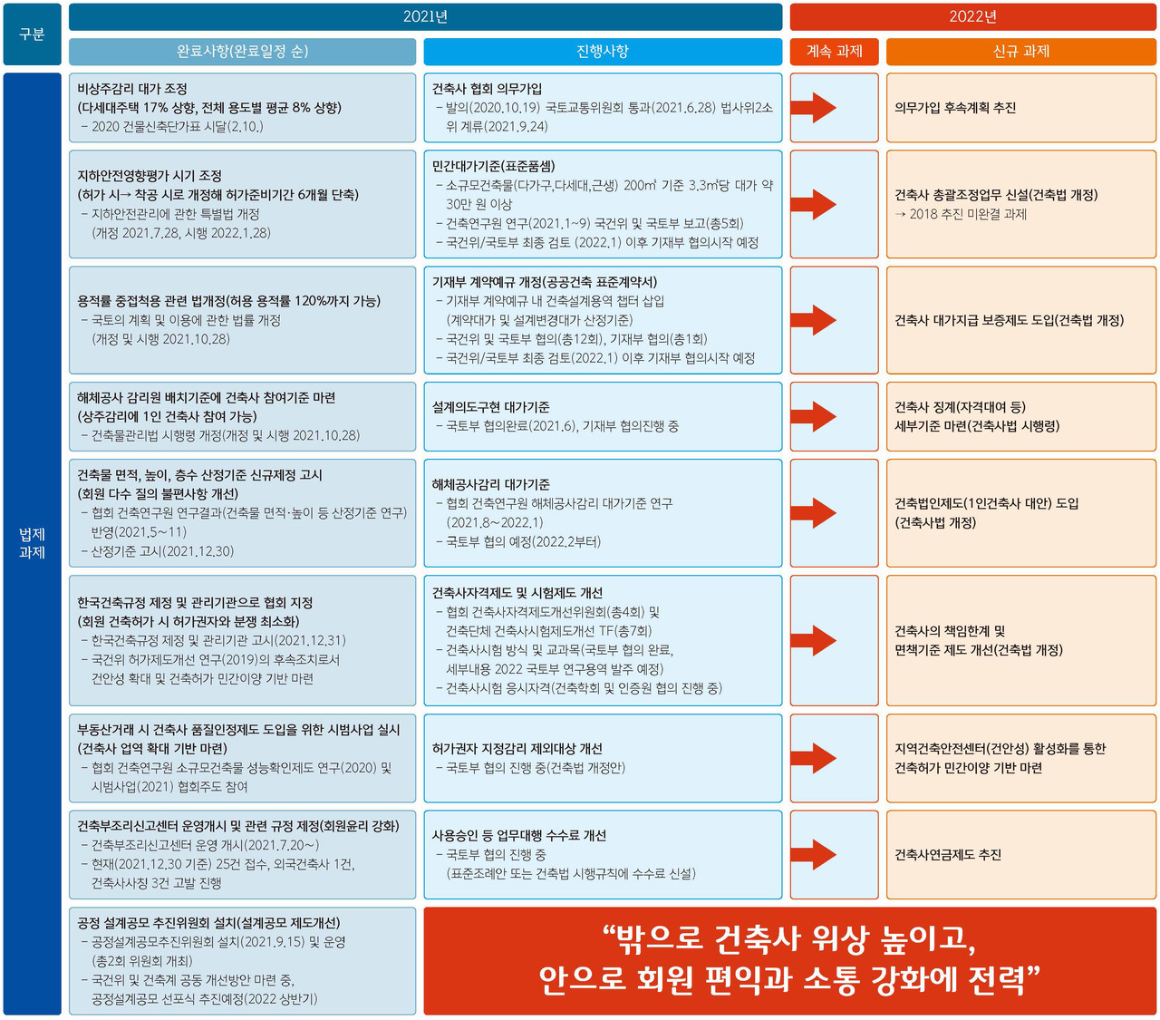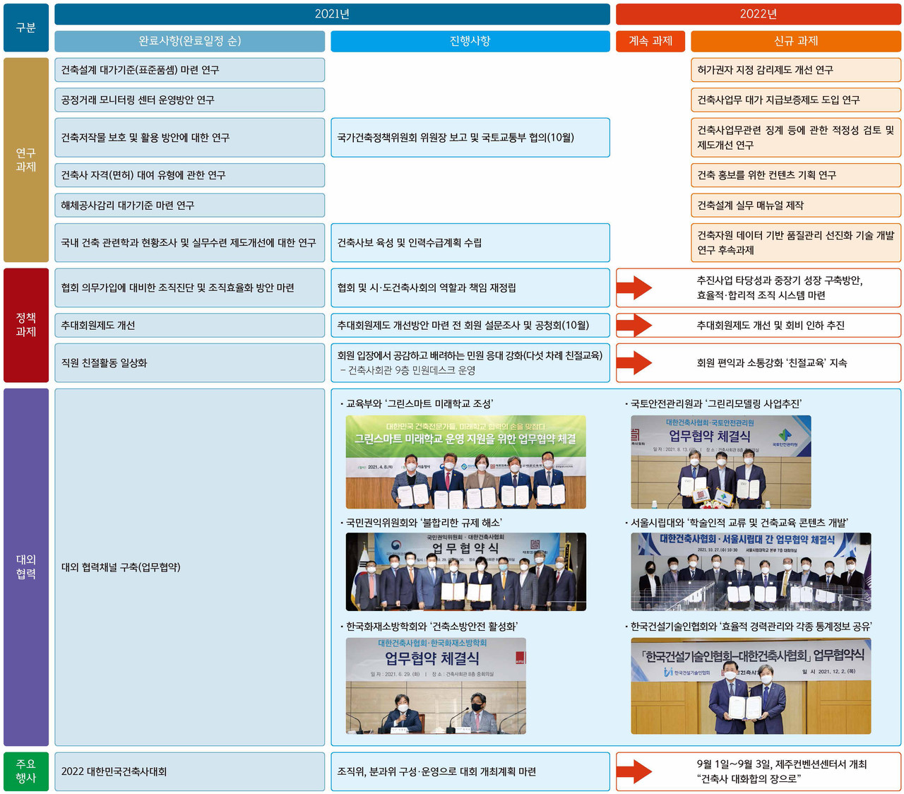 신년 이러한 기조를 본격화하는 협회는 ‘혁신 도약’을 새해 키워드로 삼았다. ▲공공발주 대가 적합성 검증을 위한 공정거래 지원센터 운영 ▲의무가입 비전 및 2022 대선 관련 도시·건축 정책 마련 연구 ▲건축도면 저작권보호센터 지정 추진 ▲건축사 자정을 위한 윤리 모니터링센터 운영 ▲국민 건축상담 및 정보 플랫폼 마련 등의 협회 의무가입 법제화 후속 계획을 이행하고, 기존 연구를 기반으로 한 제도개선 노력에 더한 ‘한 걸음’으로 올해 ①건축사업무 대가 지급보증제도 도입 ②건축사 업무 관련 징계 등에 대한 적정성 검토와 제도개선 ③허가권자 지정 감리제도 개선 ④건축설계 실무 매뉴얼 제작 ⑤건축홍보 콘텐츠 기획 ⑥건축자원 데이터 기반 품질관리 선진화 기술 개발 연구 후속과제 연구를 추진한다.