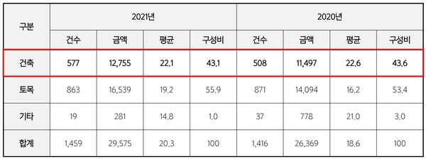 협회는 해당 기간 한국토지주택공사(LH) 도로 및 아파트 건설공사(21건/1826억원)와 인천광역시 청라 연장 건설공사 및 우수저류시설 설치사업(4건/327억원) 등이 영향을 미친 결과라고 설명했다.