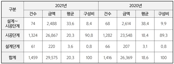 설계(설계 전)단계의 발주금액은 220억 원으로 207억 원인 전년대비 6.3% 증가했지만, 건수는 61건으로 전년도(66건)에 비해 7.6% 줄었다.