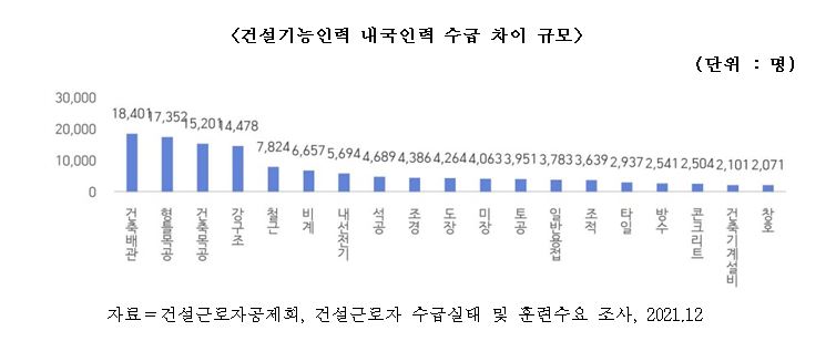 보고서에 따르면 내국 인력 공급은 전 직종에 걸쳐 공급 부족이 예상되고, 특히 건축배관, 형틀목공, 건축목공, 강구조 등의 직종에서 부족 규모가 큰 것으로 나타났다.