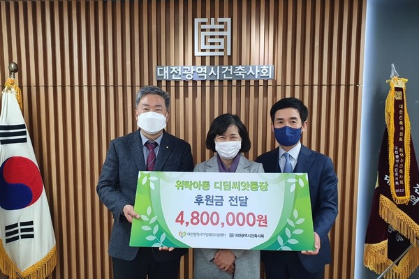 대전광역시건축사회는 대전가정위탁지원센터와 협약을 맺고 저소득층 10명의 학생에게 매달 4만원씩 1년간 총 480만 원의 디딤씨앗통장 후원금을 지원했다. 좋아요0싫어요0후속기사 원해요0 서정필 기자 htgsj@naver.com 다른기사 보기 저작권자 © 대한건축사협회 건축사신문 무단전재 및 재배포 금지 당신만 안 본 뉴스 2025년도 제2회 건축사 자격시험 합격예정자 526명…명단은 14일 국토교통부와 대한건축사협회 누리집에 공고 [수상 그 후] 2025 부산다운건축상 우수상 수상작 ‘어반에그’(유대우 건축사, 유가건축사사무소) 공공성·포용성·지속 가능한 노후주거지 정비 방안은?…“지역에 맞는 개발방식 도입해야” 국토부, 중소건설사 PF 1조 원 규모 유동성 지원 시장 양극화·신규 인력 유입 줄어들며 위기 맞는 건축산업, 지금이 ‘골든타임’ [건축사의 작품노트] 실내외 구분 없이, 마당 공간적으로 감싼 ‘마호가니 카페 강화점’ - 김정숙 건축사·(주)이드 건축사사무소 (인천광역시건축사회) 2026 건설·주택·부동산 경기, ‘제한적 회복세’ 전망 2025년도 제2회 건축사 자격시험 합격예정자 526명…명단은 14일 국토교통부와 대한건축사협회 누리집에 공고 댓글삭제 삭제한 댓글은 다시 복구할 수 없습니다. 그래도 삭제하시겠습니까? 비밀번호 닫기 기사 댓글 0 댓글 접기 댓글입력 권한이 없습니다. 댓글 내용입력 비회원 로그인 이름 비밀번호 댓글 내용입력 댓글쓰기 계정을 선택하시면 로그인·계정인증을 통해 댓글을 남기실 수 있습니다. 회원 로그인 이름 비밀번호 자동등록방지 로그인 옵션 창닫기 주요기사 도시공간 디자인 품격 향상 위한 총괄계획가 지원 사업 공모 국민 안전 위협하는 위반건축물, 사전 예방 위한 규제완화에 ‘기대’ [특별칼럼] 대한건축사협회가 설계공모를 주관하는, 비현실적이지만 아주 상식적인 상상 [사설] 건축사의 눈앞에 직면한 문제해결도 골든타임 ‘2025 대한민국목조건축대전’ 대상에 치유의 집·산림복지종합교육센터 선정 서울특별시건축사회, 서울시건축사회장기 당구대회