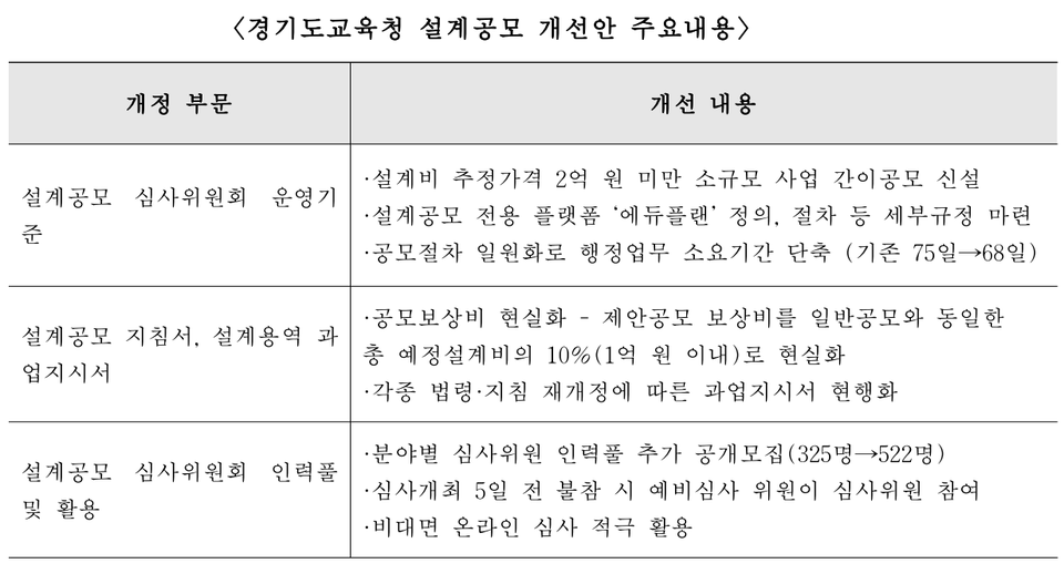 개선안에 따르면 2월부터 온라인 설계공모 플랫폼 에듀플랜으로 공모 운영을 일원화하고, 사업비 2억 원 미만 소규모 사업은 공모절차를 간소화하는 간이공모제를 도입한다는 내용이 핵심이다.