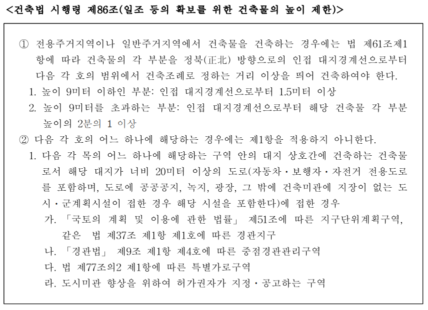법제처는 이번 사안의 경우 건축물을 건축하기 위한 두 대지가 이미 너비 20미터 이상의 도로에 접하고 있어 도로 방향으로의 일조권 확보가 용이한 경우이고, 추가적으로 두 대지 사이에 건축이 금지된 공지가 있는 경우에 해당돼, 건축물을 건축할 때 인접 대지경계선으로부터 일정거리를 띄어 건축하지 않아도 된다고 보는 것이 규정의 취지에 부합하는 해석이라고 밝혔다.