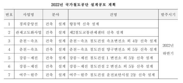 올 하반기에는 또 관제고도화사업을 통해 제2철도교통관제센터 신축 설계 ▲춘천∼속초 철도건설 속초변전소 외 4동 신축 설계 ▲춘천∼속초 철도건설 양구변전소 외 5동 신축 설계 ▲강릉∼제진 철도건설 1 변전소 외 5동 신축설계 ▲강릉∼제진 철도건설 2 변전소 외 5동 신축 설계 ▲여주∼원주 철도건설 운전보안시설 2동 신축설계 등이 계획돼 있다.
