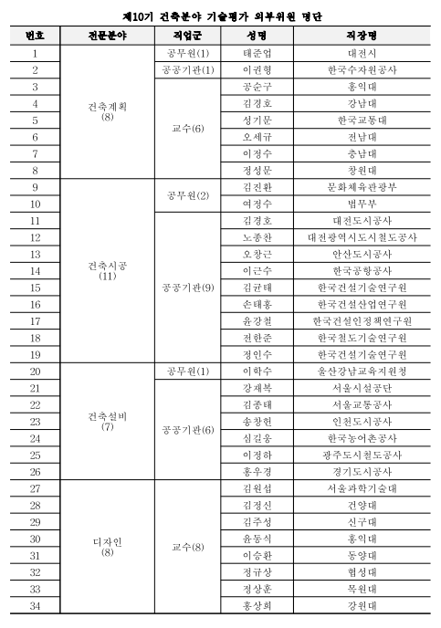 철도공단은 또 이날 제10기 기술평가 외부위원 명단도 공개했다. 건축계획 분야 공순구 홍익대학교 교수를 비롯해 34명이 이에 해당한다. 심사위원풀은 설계공모 운영지침에 따른 것으로, 설계공모 심사는 심사위원풀에서 위원회가 구성돼 진행된다.