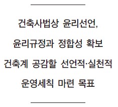 협회 관계자는 “건축사법상 윤리선언, 윤리규정 간 정합성을 확보하면서 이권개입 금지, 건축심의·설계공모 비리 부정 등 문제가 될 수 있는 기준과 관련된 실제 케이스들을 바탕으로 모든 건축사가 동의할 수 있는 윤리적 내용 또는 가이드 라인이 마련될 것”이라며 “이를 위해서 해외 사례 조사·분석과 더불어 초안 마련에 대한 연구가 의뢰되고, 당연히 건축계가 공감할 수 있는 윤리강령 제정을 위한 공청회 또는 토론회가 열릴 계획이다”고 전했다.
