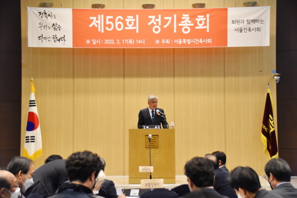 서울특별시건축사회 제56회 정기총회가 3월 17일 서초구 건축사회관 1층 대강당에서 열렸다. 이날 총회는 ▲전회회의록 승인 ▲주요업무보고 ▲감사보고가 진행됐다. 이날 총회에서는 ▲서울특별시건축사회 회칙 개정(안) 승인의 건 ▲2021회계년도 회계별 수지결산(안) 승인의 건 ▲2022회계년도 회계별 사업계획 및 수지예산(안) 승인의 건이 원안대로 승인됐다.