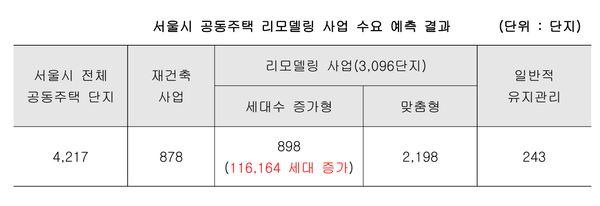 서울시에 따르면 2030년 기준 서울시 전체 공동주택 단지 중 73.4%가 리모델링 사업이 가능할 것으로 추정된다. 서울시 4,217개 단지 중 재건축 예상 단지는 878개, 세대수 증가형 리모델링 898개, 맞춤형 리모델링 2,198개, 일반적 유지관리는 243개 단지로 분석된다. 결과적으로 리모델링 연한인 15년 이상된 공동주택 단지는 모두 3,096개로 전체의 73.4% 수준이다. 시는 세대수 증가형 리모델링을 통해 11만6,000가구의 주택공급이 가능할 것으로 예상했다.