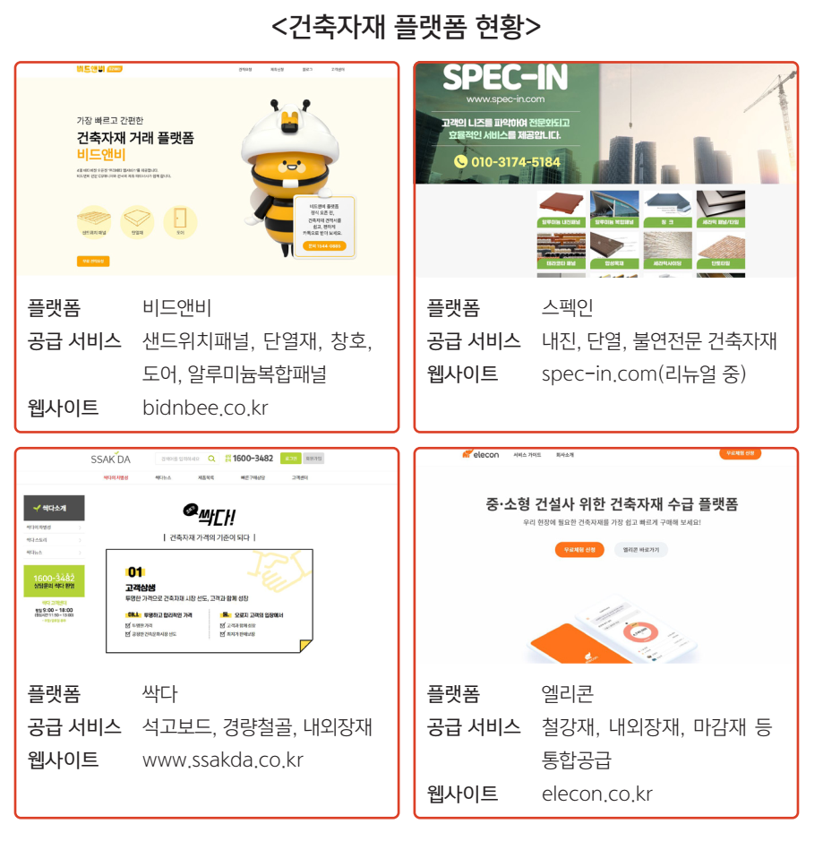 다양한 건축자재를 소개하면서 설계의도 구현을 돕기 위한 건축자재 플랫폼도 있다. 내진, 단열, 불연전문 건축자재 플랫폼인 스펙인은 건축자재 컨설팅 서비스를 제공한다.