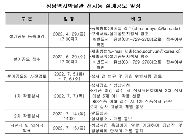 성남시 관계자는 “성남역사박물관은 탄천에서 시작된 성남의 구석기 시대부터 1970년대 광주대단지, 1990년대 분당·판교로 이어지는 도시 발전의 모든 과정을 전시하게 될 것”며 “창의적 건축 설계작품을 선정해 시민의 역사를 상징하는 공간으로 만들어 나갈 것”이라고 말했다.