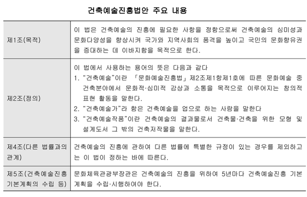 국민 생활환경과 밀접한 건축을 문화·예술로 진흥하기 위한 토론회가 열렸다. 법제화를 통한 ‘건축예술’ 개념 도입, 이의 진흥을 위한 근거 마련 입법화 논의도 본격화되는 모양새다. 반대로 법안이 기존 건축 관련 법령과 상충되고, 무자격자에게 자격을 인정케 하는 데 악용될 수 있다는 우려도 제기됐다.
