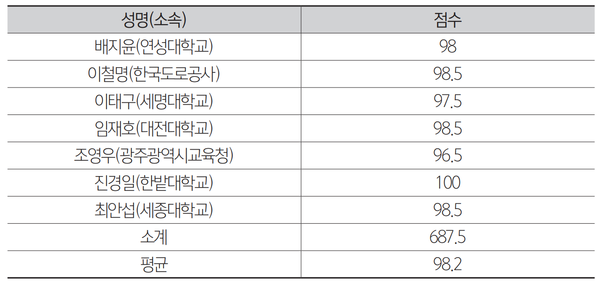 이 공모에는 한국도로공사와 광주광역시교육청 관계자 각 1명 그리고 5명의 대학교수가 심사에 임했다. 진경일 심사위원(한밭대학교)이 100점으로 최고 점수를, 조영우 심사위원(광주광역시교육청)은 96.5점으로 최저점을 줬다.