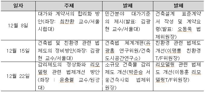 이번 포럼의 대주제는 ‘건축이 국가브랜드이다’로, 12월 8, 15, 22일 오후 2시 건축사회관 3층 국제회의실에서 열린다.