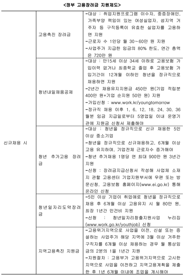 우선 근로자를 신규 고용할 계획이 있다면 ▲고용촉진 장려금 ▲청년 추가고용 장려금 ▲청년내일채움공제 ▲지역고용촉진 지원금을 알아볼 필요가 있다.
