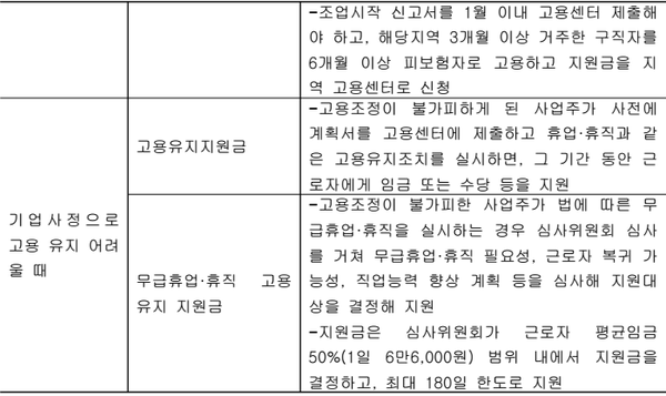 기업사정이 어렵지만 감원 없이 휴업·휴직 등을 시행할 경우 고용유지지원금을 활용할 수 있다. 고용조정이 불가피하게 된 사업주가 사전에 계획서를 고용센터에 제출하고 휴업·휴직과 같은 고용유지 조치를 실시하면, 그 기간 동안 근로자에게 임금 또는 수당 등이 지급된다. 이때 고용유지조치 기간과 그 이후 1개월까지 당해 사업장 소속 근로자를 고용조정으로 이직시키지 않아야 한다. 사업주가 지급한 휴업·휴직수당의 3분의 2가 지원되는데 1일 한도는 6만6,000원이다. 휴업·휴직은 모든 지원일 수를 합해 당해 보험연도 동안 180일 한도로 지원된다.