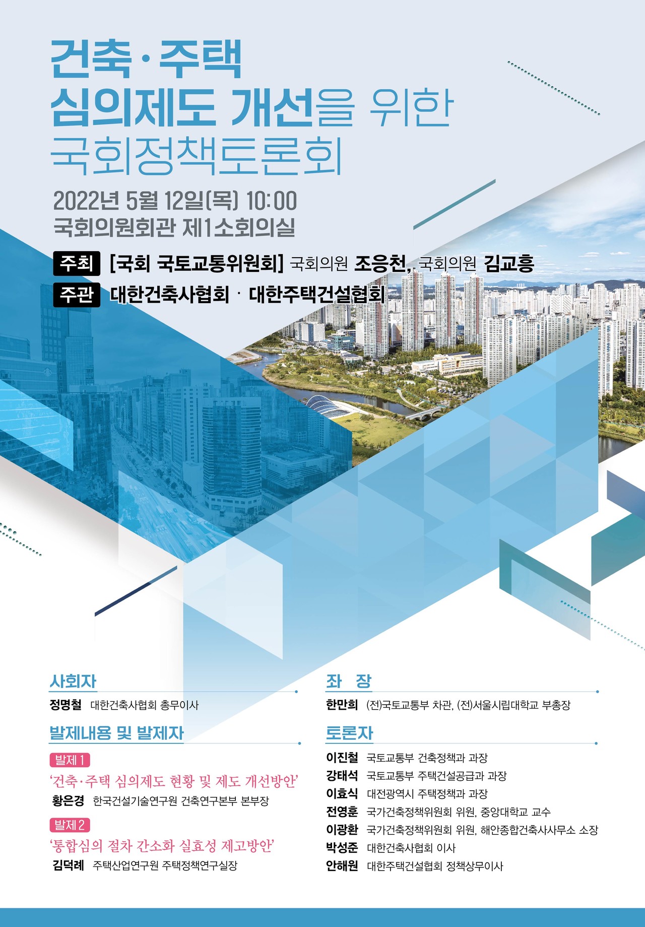국회 국토교통위원회 조응천 국회의원·김교흥 국회의원 주최, 대한건축사협회·대한주택건설협회가 주관하는 ‘건축·주택 심의제도 개선을 위한 국회정책토론회’가 5월 12일 오전 10시, 국회의원회관 제1소회의실에서 열린다. 건축 심의제도 개선은 의무가입 후속조치 사항 중 하나다.