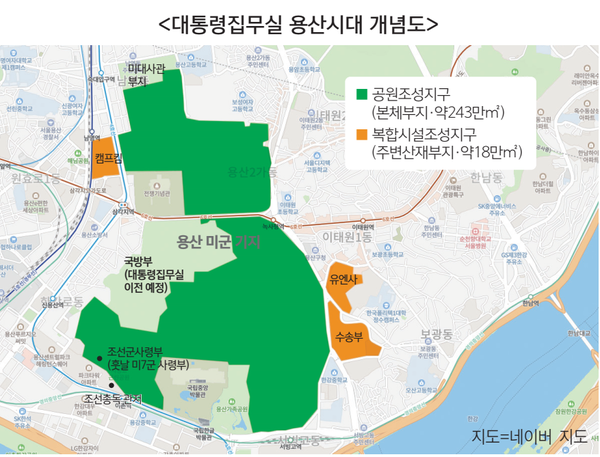 서울 중심에 위치한 용산지역은 풍수지리적으로 남산을 등지고 한강을 내려다보는 배산임수(背山臨水)의 형세를 가진 곳이었지만, 지난 100년간 외국 군대 주둔에 따라 강북과 동서가 단절됐다.