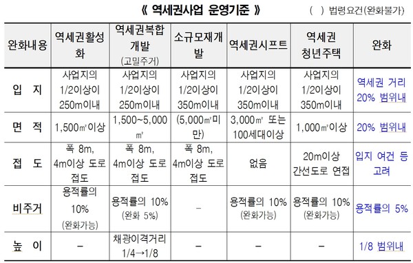 이는 개발 잠재력이 있음에도 사업기준을 충족하지 못한 대상지도 사업추진의 길을 열어주기 위한 것으로 특별계획구역 내 역세권사업 운영기준에 입지, 면적, 접도, 비주거용도비율, 채광방향 높이에 대한 완화 근거를 새롭게 마련했다.