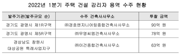 1분기 가장 규모가 큰 사업은 경기도 광명시가 발주한 ‘광명 제1R구역 주택재개발정비사업 감리자 용역’으로 추정가격이 125억 원 수준이다.