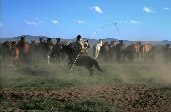 아르항가이로 가는 길에 드넓은 초원의 낮은 산들과 맑은 하늘이 어우러진 풍경에 눈앞이 시원해진다. 그 배경 아래로 말과 야크 들이 떼를 지어 다투듯 달리는데 긴 장대를 들고 그들을 몰고 있는 청년, 힘차게 돌진하는 그의 뒤태에 먼지가 안개처럼 피어오른다. 그 생기 넘치는 모습에 순간 롤러코스터를 탄 듯 신이 난다. 망설임 없이 나아가는 리더십, 청춘이다.