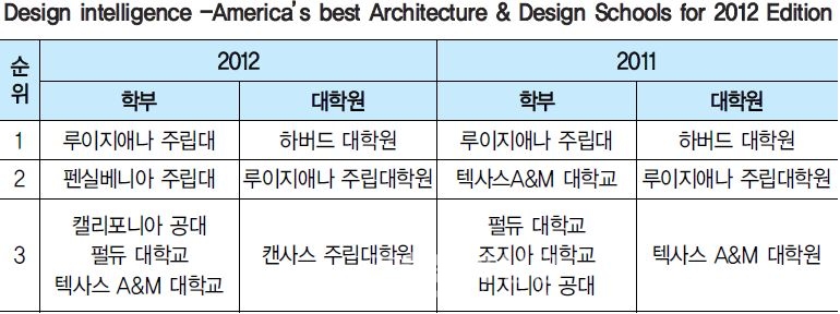 북미지역에서 가장 공신력 있는 건축학과 순위 조사기관인 'Design Intelligence'가 2012년 최고의 건축디자인 대학순위를 발표했다.