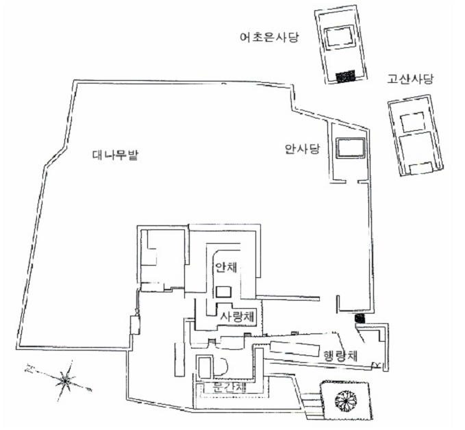 해남 윤고산 고택인 녹우당을 보면 안채, 사랑채, 문간채가 일직선 종축상에 석三자로 배치되어 있다.<그림3, 사진5> 뒷산의 산세가 길게 뻗어 내려오기 때문인데 이런 집이 우리나라에서는 오히려 드믄 편이다. 여기서 왜 대문간이 집 앞으로 나서지 않고 측면으로 나고 고샅 안에 가려져 있는가는 다음에 설명하기로 한다.